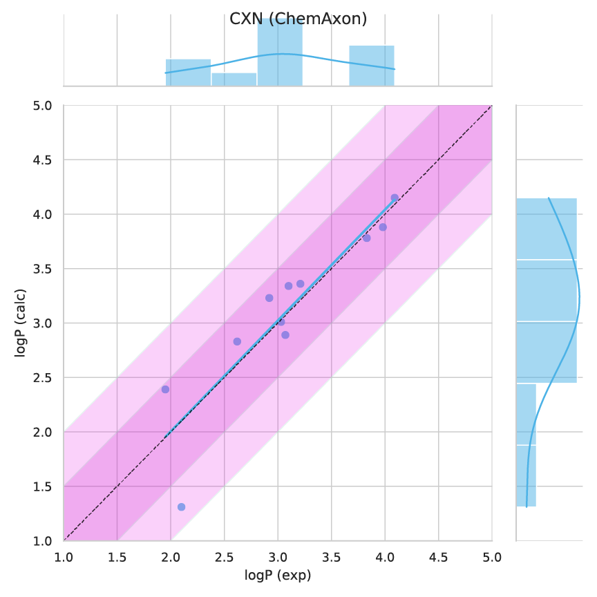 Chemaxonの計算ツールは、他の参加者と比較して最も低いRMSE、MAE、および最も高いR2を示し、最も正確な予測モデルとして評価されました。この11の新規化合物データセットでは、わずか1つの構造が0.5以上の単位の誤差を持っていました。この難しいエントリーは、測定値と計算値を比較して1 log unit未満の偏差を持っていました。詳細は、私たちのホワイトペーパーでご覧ください。